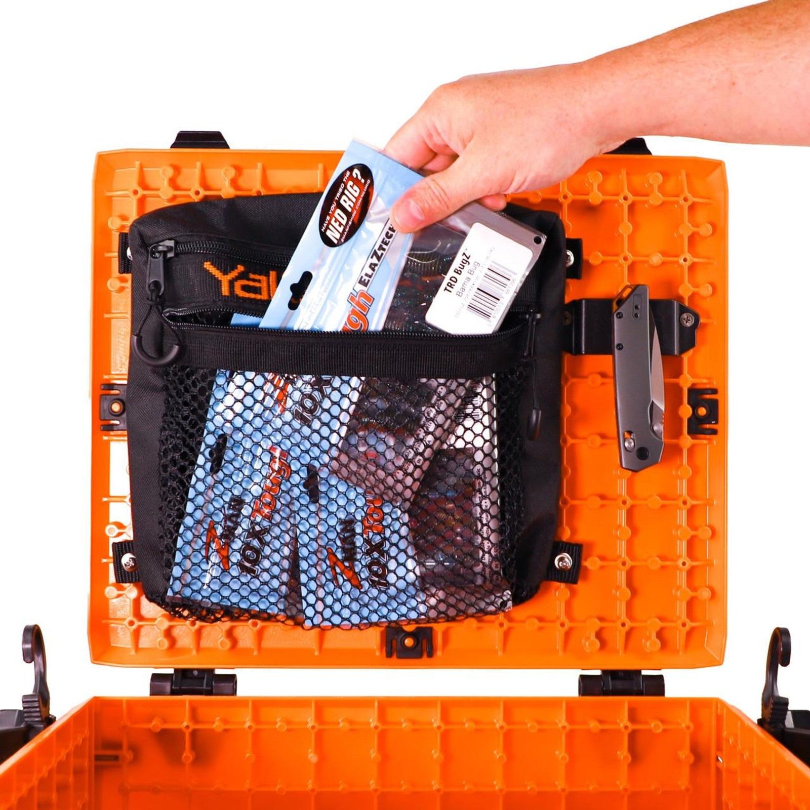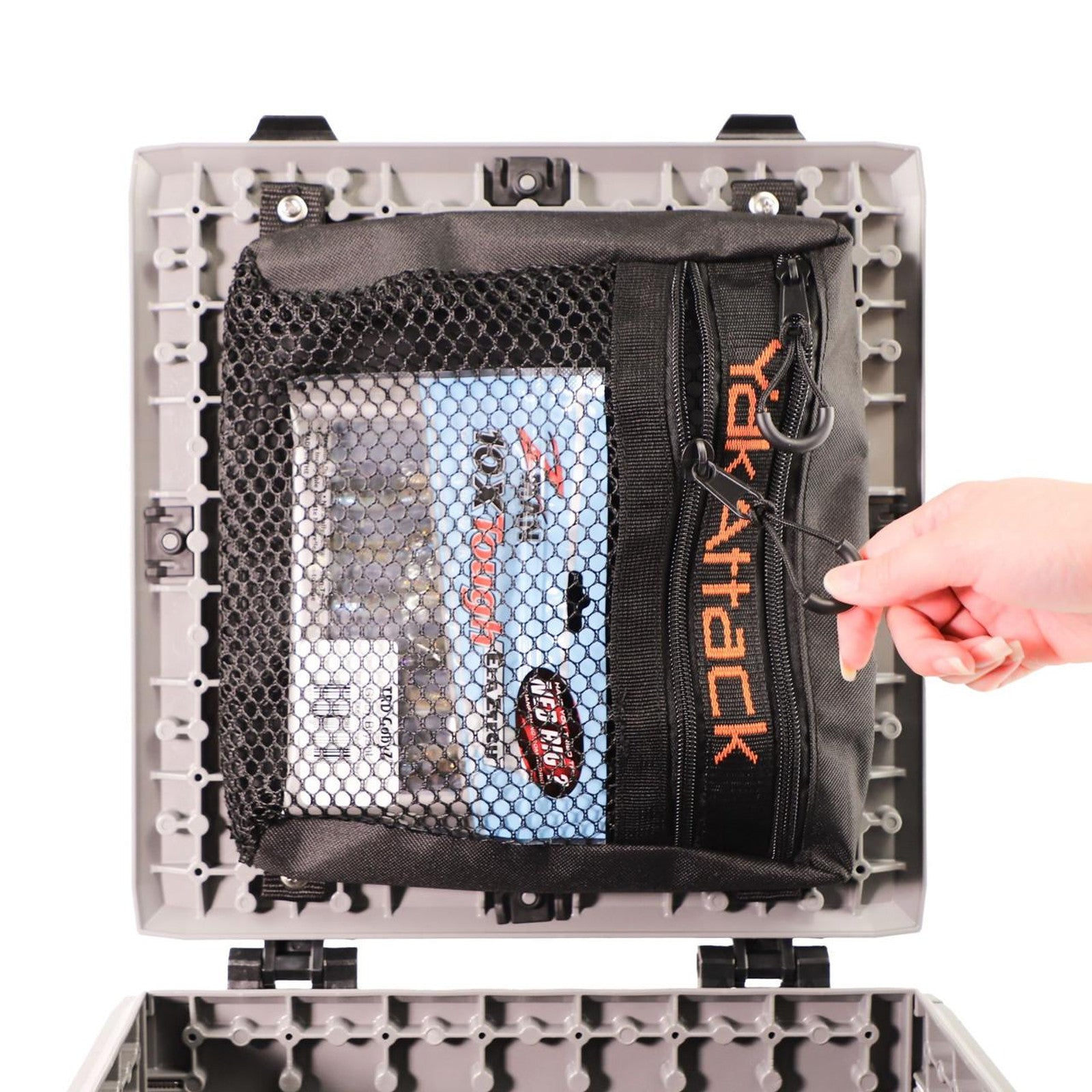 The mesh design not only helps in quick identification of contents but also ensures water drainage, keeping your gear dry and accessible. Whether mounted inside or outside your crate, this storage bag makes accessing your gear a breeze.